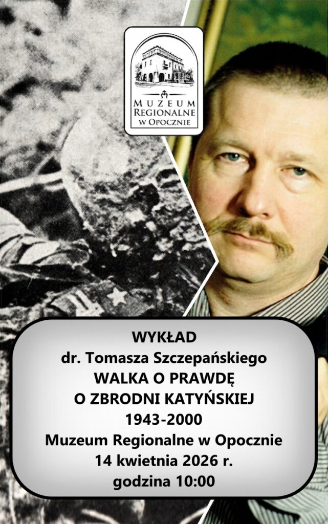 Z okazji Dnia Pamięci Ofiar Zbrodni Katyńskiej Muzeum Regionalne w Opocznie zaprasza na wykład dr. Tomasza Szczepańskiego, kustosza Muzeum Katyńskiego w Warszawie zatytułowany „WALKA O PRAWDĘ O ZBRODNI KATYŃSKIEJ 1943-2000”.